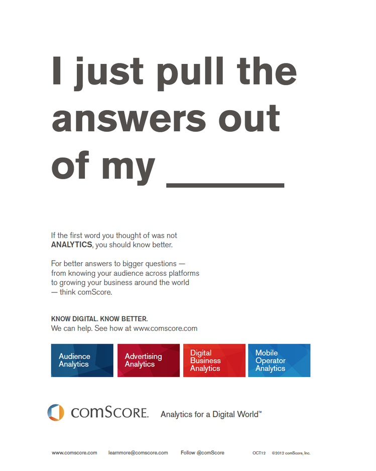 comScore was evolving from a measurement company to a measurement and analytics company and needed to communicate this revised positioning. The "I just pull the answers out of my _____" campaign was developed to reinforce the word "analytics" in a witty and memorable way. This set the stage for the "Be brave / comScore has your answers" agency campaign the following year.